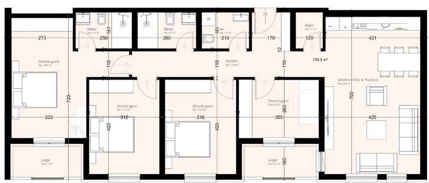 A modern and elegant apartment is offered for sale in the well-known Clinton Residence, located on Marie Shllaku Street – Gjilan, with a total area of 139.3 m², positioned on the 5th floor of the building. The apartment is near completion and will be ready for occupancy in March, offering the opportunity to move quickly into a brand-new home built according to the highest contemporary construction standards. The interior spaces are thoughtfully designed to provide maximum comfort, functionality, and a high-quality lifestyle for modern families. This property represents a secure choice both for living and investment, thanks to its favorable location and high construction quality. Layout of the Apartment: | 1 Living room | Kitchen with dining area | 4 Bedrooms | 3 Bathrooms | 2 Terraces | 1 Storage room Advantages: | The apartment will be ready for occupancy in March | Quiet and family-friendly location | Close to essential services and residential areas 📌 For more information or to schedule a viewing, please contact us!