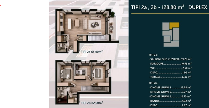 For sale: a 128.80 m² Duplex apartment located in the modern and highly desirable Hill Side residential complex in Prizren. The apartment features a split-level design, ample space, and a functional layout ideal for large families or those seeking maximum comfort. 1 Living room with kitchen 1 Bathroom 1 Toilet 1 Utility 1 Terrace Second level: 3 Bedrooms 1 Bathroom 1 Utility Financing available through BKT for up to 15 years, with no additional mortgage required. Developed surrounding infrastructure: schools, supermarkets, public transport, and recreational areas. An ideal property for families seeking space, privacy, and a long-term investment in one of Prizren’s most desirable neighborhoods. 🏗️ The building will be in June 2026. 📌 For more information or to schedule a visit, feel free to contact us!