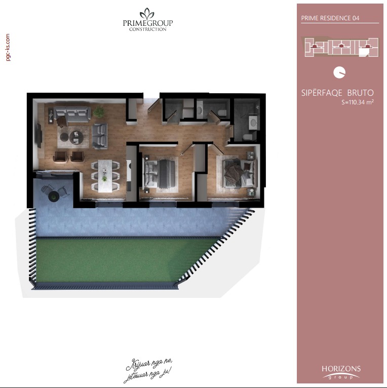 For sale: A 110.34 m² apartment, located in the Prishtina e Re neighborhood, within the Prime Residence complex, on the first floor, Entrance C-04. The apartment offers a modern layout and generous space, making it ideal for family living or investment. 1 Living room with kitchen 2 Bedrooms 1 Bathroom 1 Toilet 1 Utility room 1 Storage room 1 Terrace 1 Green terrace The Prime Residence complex provides a quiet, secure, and well-maintained living environment, with close proximity to main roads, public transport, shopping centers, and all essential services. 🏗️ The building will be completed in 2027. 📌 For more information or to schedule a viewing, please contact us!