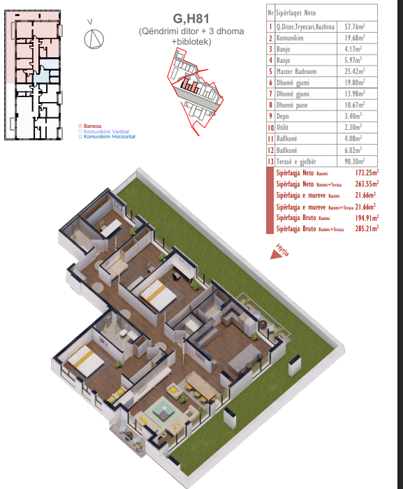 Shitet banesë me sipërfaqe 194.90 m² për banim + tarracë e gjelbër, me sipërfaqe totale 285.21 m², në kompleksin SHIKI, rruga “Malush Kosova”, Prishtina e re. Banesë shumë e bollshme, moderne dhe e organizuar në mënyrë efikase, e pozicionuar në Bllokun G/H, në katin 9, hyrja G/H–81. Ideale për familje të mëdha që kërkojnë komoditet maksimal, hapësirë të gjerë dhe një tarracë të jashtëzakonshme për përdorim rekreativ. 1 Qëndrim ditor dhe kuzhinë 1 Hapsirë komunikimi 1 Dhoma kryesor e gjumit 3 Dhoma gjumi 1 Depo 1 Hapësirë ndihmëse 2 Banjo 2 Terasë 1 Terasë e gjelbër Banesë unike në llojin e saj, me hapësira të bollshme dhe tarracë private të madhe, brenda një kompleksi të njohur për cilësi të lartë ndërtimi dhe qetësi maksimale. 🏗️ Objekti përfundon në vitin 2028. 📌 Për më shumë informata ose vizitë në pronë, na kontaktoni!